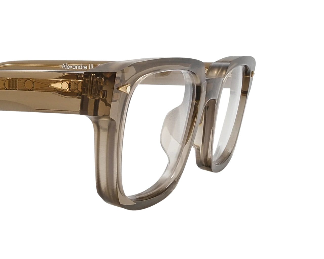 Bågen är tillverkad i högkvalitativt acetat och handgjord i Frankrike, med detaljer som 22k guldförgyllda gångjärn och en råskuren finish som skapar en diskret kontrast mellan matt och blank yta. Alexandre III passar perfekt för dig som vill bära något stilrent och genomtänkt, med en form som är både tidlös och självsäker.